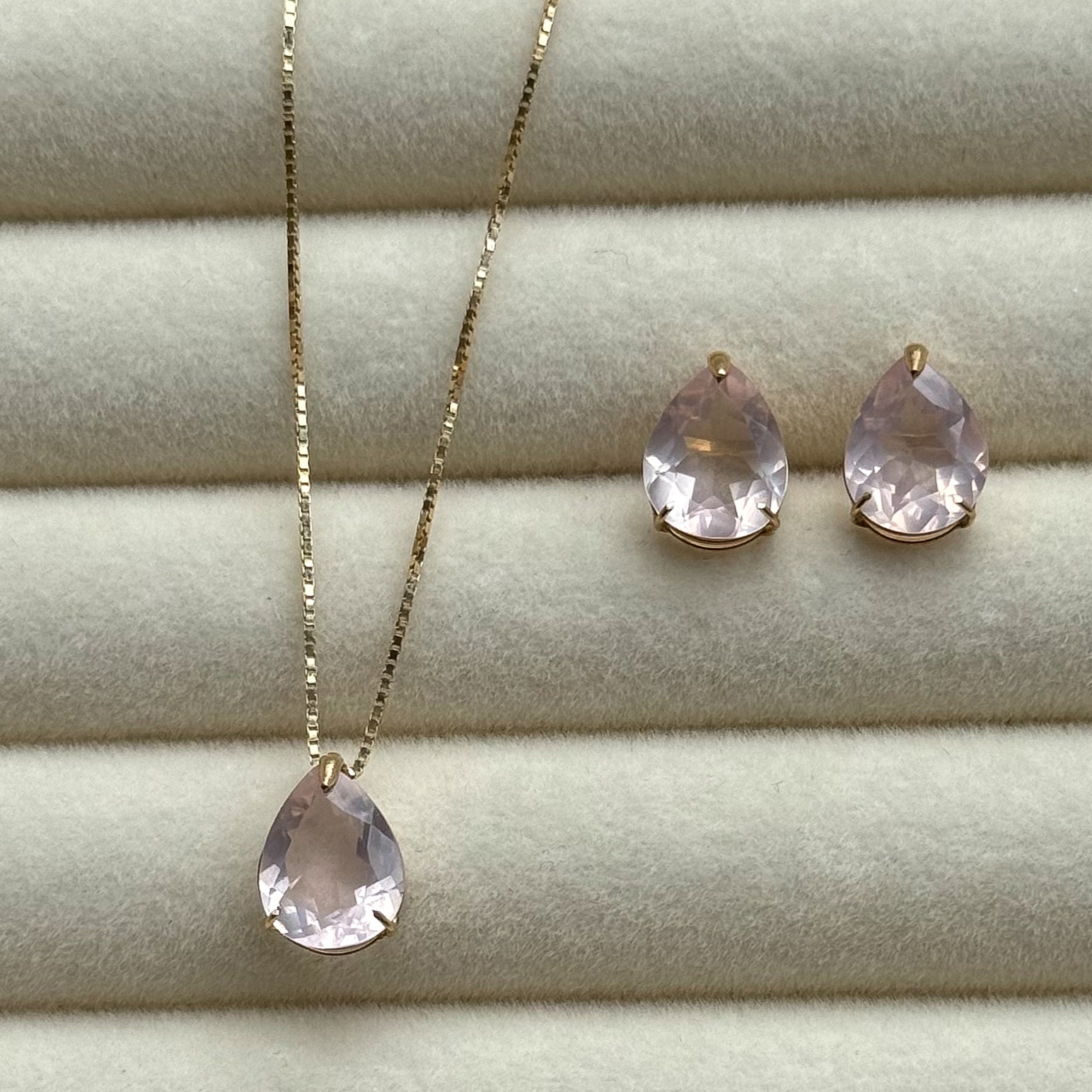 Este elegante conjunto em ouro 18k é composto por uma corrente Veneziana, um pingente em quartzo rosa e um par de brincos combinando. Um conjunto de joias completa para quem busca delicadeza, beleza e sofisticação em um único kit.